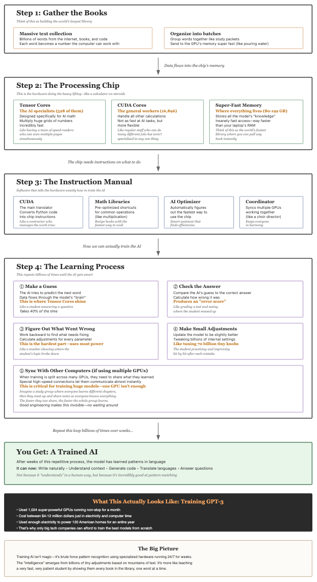 This isn’t just about faster processors. It’s about a complete stack—hardware, software, algorithms, and engineering—optimized down to the transistor level for one purpose: turning oceans of text into statistical models that can predict what comes next. The process diagram in the companion artifact maps that entire journey. Keep it handy as we go deep.